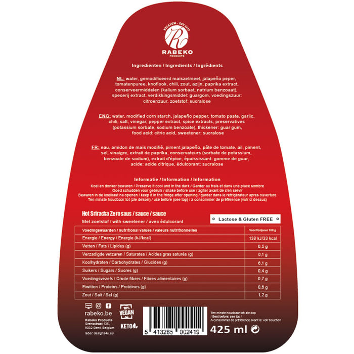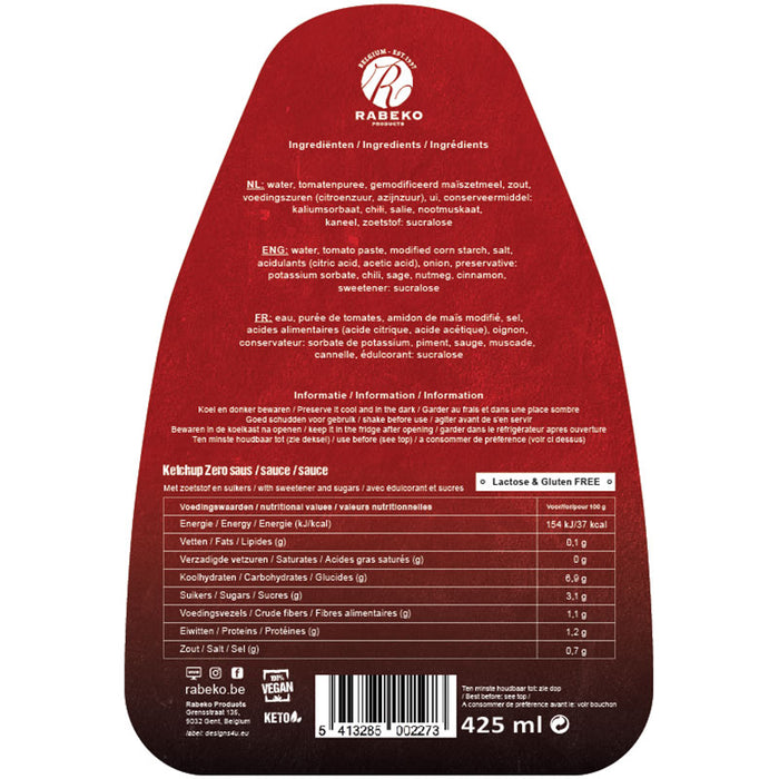 Vous rêvez de rendre vos repas plus savoureux, mais sans prendre de kilos ? Les sauces Zero de Rabeko sont aussi délicieuses que les sauces classiques, mais contiennent peu de calories. Elles existent en une série de goûts différents et peuvent se consommer chaudes ou froides. Dans les sauces Rabeko, le sucre est remplacé par de la sucralose, qui apporte un goût similaire, mais sans l’ajout important de glucides et de sucres. Qui plus est, toutes les sauces Rabeko conviennent aux végétaliens.