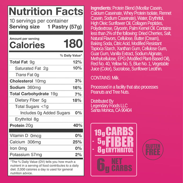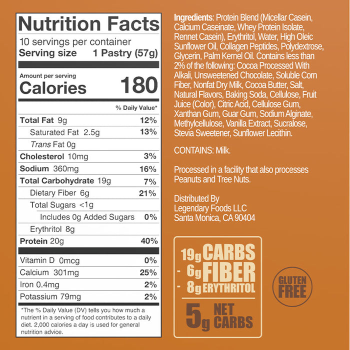 Savourez le goût de votre enfance sans sucre. La pâtisserie savoureuse Legendary Foods est une collation douce, sucrée et délicieuse que vous pouvez manger dès la sortie de l'emballage ou griller légèrement pour une expérience chaleureuse. Legendary Foods a pu fabriquer un produit que vous avez mangé pendant votre jeunesse sans ce dont ils étaient faits : les glucides et le sucre. Ces pâtisseries conservent toutes les sensations saines et le goût délicieux tout en éliminant le pic de glycémie, créant une version à partir de vrais aliments qui soutient vos objectifs nutritionnels et vous permet de manger comme un enfant à nouveau!
